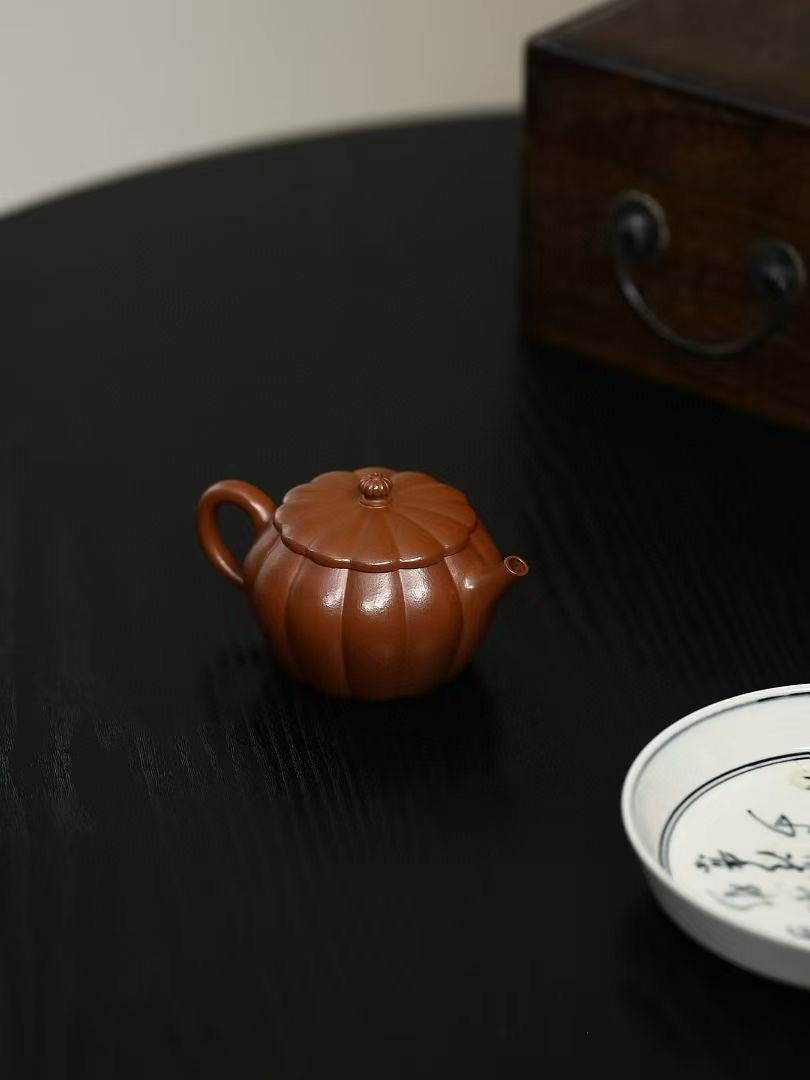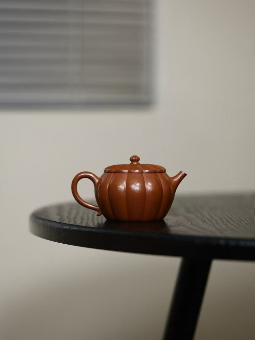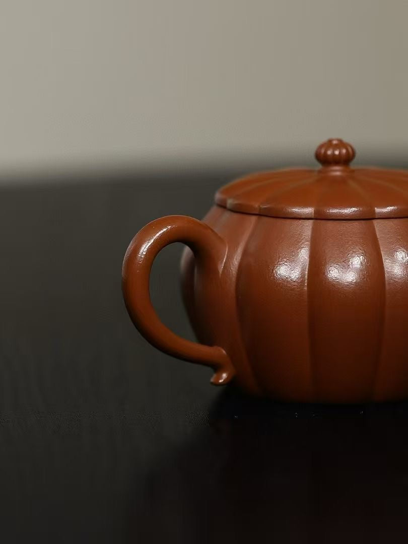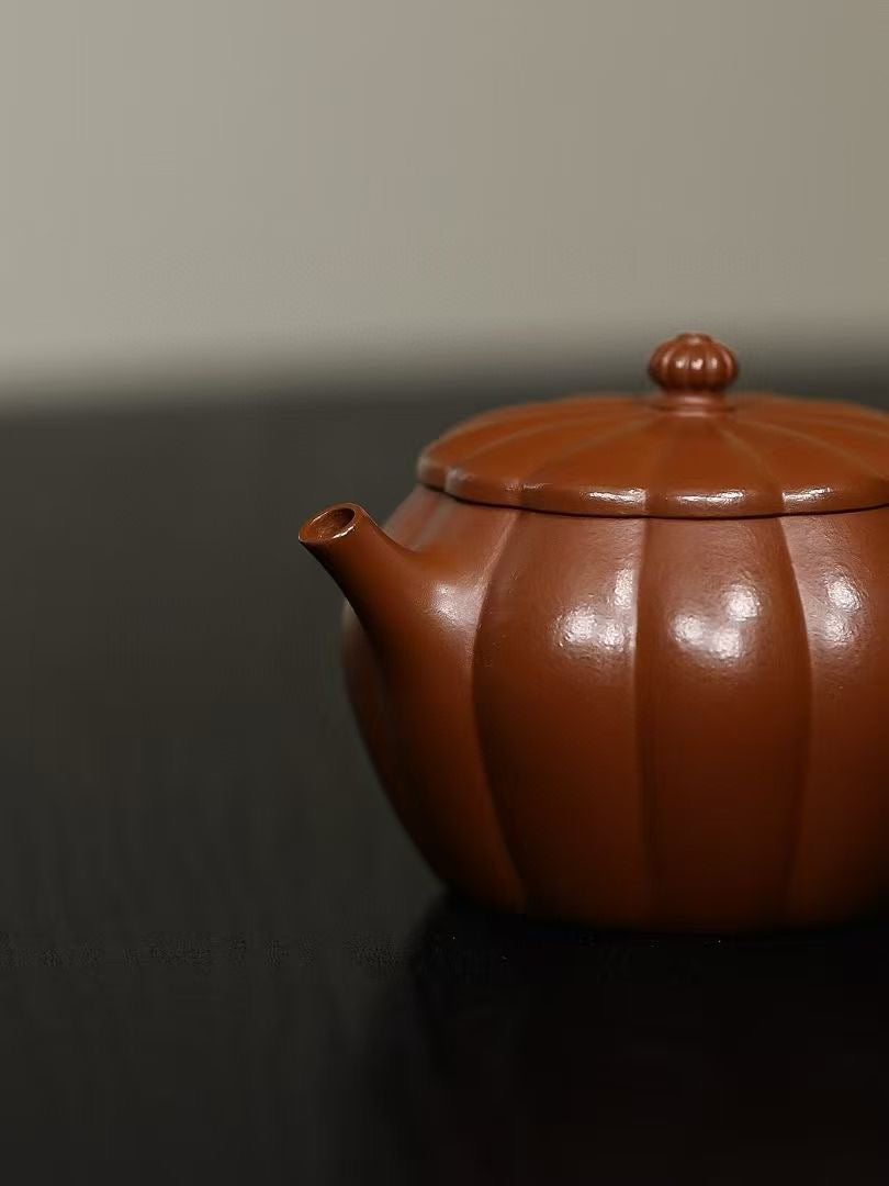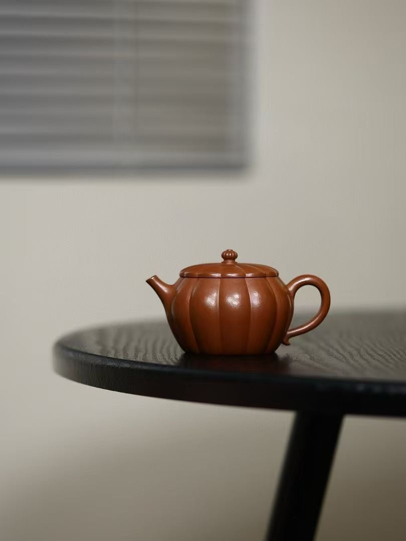 「筋紋錦鼓」は、伝統的な太鼓の姿を模した優美な造形が特徴の紫砂壷です。緻密に刻まれた筋紋が均整の取れた美しさを生み、手に取るたびに職人の高度な技術を感じさせます。