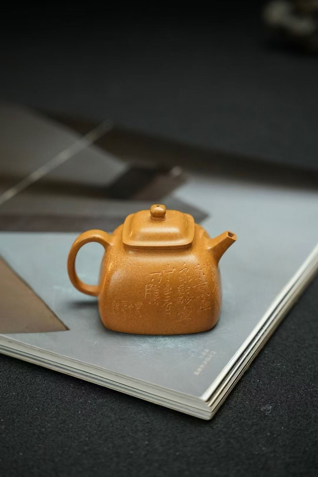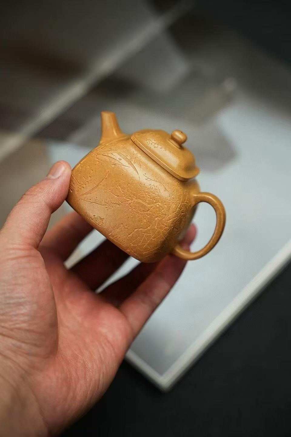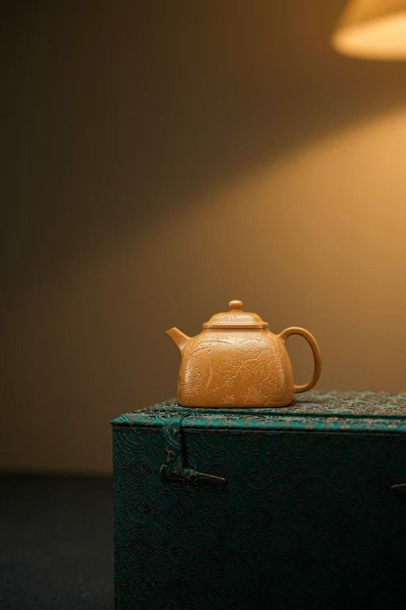 この紫砂壷は、厳選された黄金段の泥料を使用し、滑らかで艶やかな質感が特徴です。四角い形状は上品で洗練されたデザインを際立たせ、精緻な彫刻が施された壷からは、清楚で気品あふれる雰囲気が漂います。手に取ると、その美しい質感と格調高い佇まいが一層引き立ち、魅力的な風格を感じさせます。